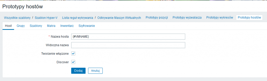 - Ustawiamy podstawowe pola. W miejscu Nazwy hosta podamy makro {#VMNAME}, które przyjmie wartość zgodnie z JSONem, który uzyskaliśmy wcześniej. Należy pamiętać, że nazwa hosta powinna być unikatowa w skali instancji Zabbix, więc może być konieczne wprowadzenie jakiegoś schematu nazewnictwa, który pozwoli na uniknięcie konfliktów.
